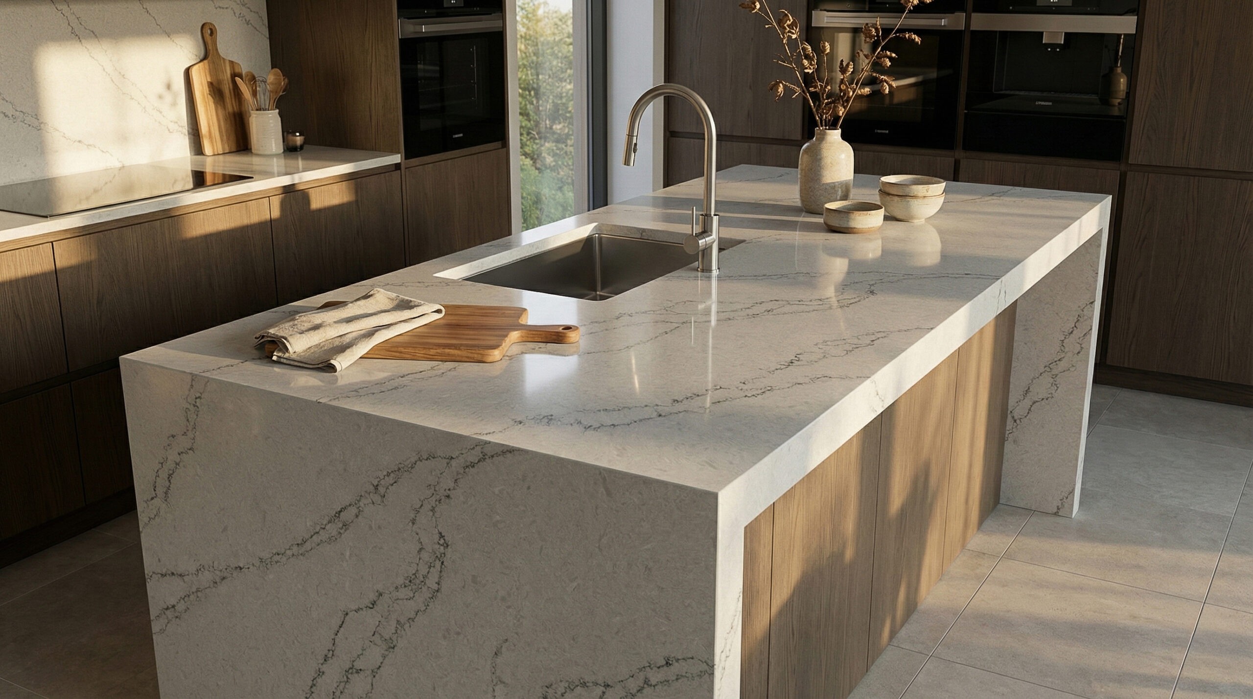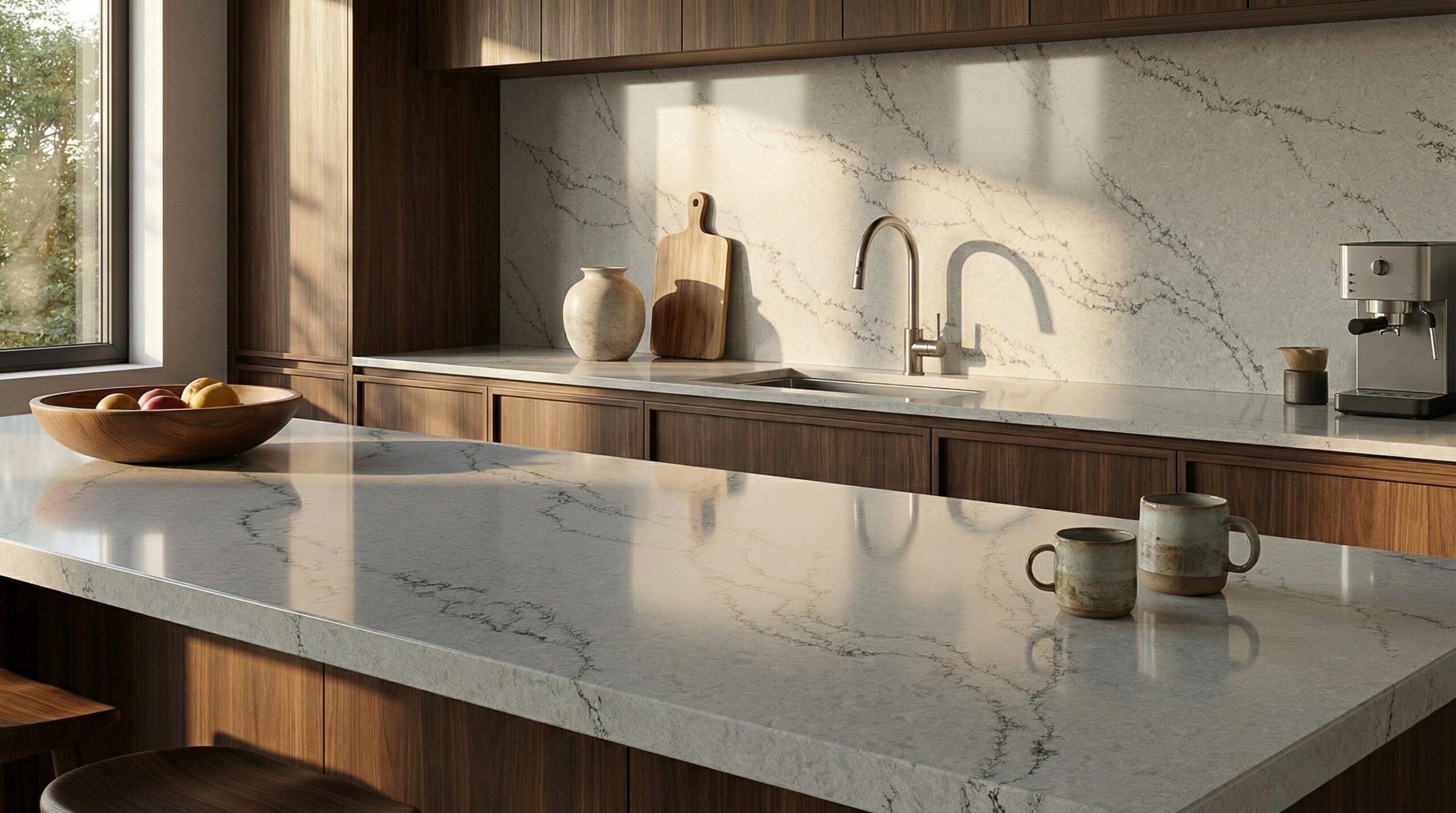 Calacatta Velvet features a soft, misty gray base with a refined and fluid aesthetic. The surface is swept by a network of charcoal-gray veining that branches diagonally across the slab with graceful, purposeful movement. These veins are intricate and slightly fractured, mimicking the natural fissures of premium Italian marble, while the background offers a subtle, tonal depth that feels smooth and cohesive. Elegant and composed, Calacatta Velvet is a sophisticated choice for transitional, classic, and modern luxury interiors, creating a distinguished foundation for islands, countertops, and backsplashes where a harmonious blend of softness and structure is desired.
