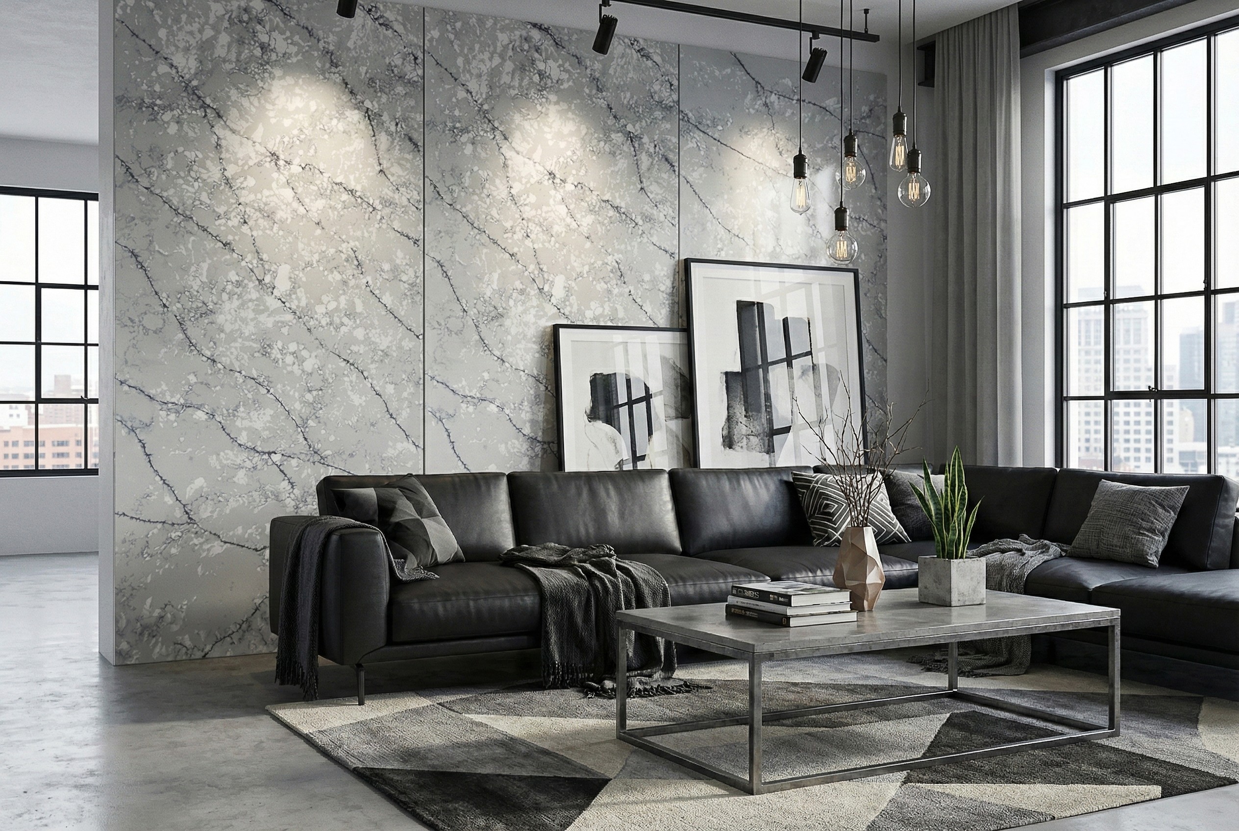 Kingsland features a robust, medium-gray base with a highly textural and dynamic aesthetic. The surface is characterized by a "brecciated" or broken-stone appearance, where large, irregular clusters of crisp white and soft dove gray are suspended within the slab. This complex, aggregate-rich composition is dramatically intersected by jagged, deep charcoal veins that branch across the surface, creating intense contrast and structural movement. Bold and earthy, Kingsland is a striking choice for industrial, modern rustic, and contemporary interiors, serving as a commanding focal point for islands, countertops, and fireplace surrounds where a raw, natural complexity is desired.