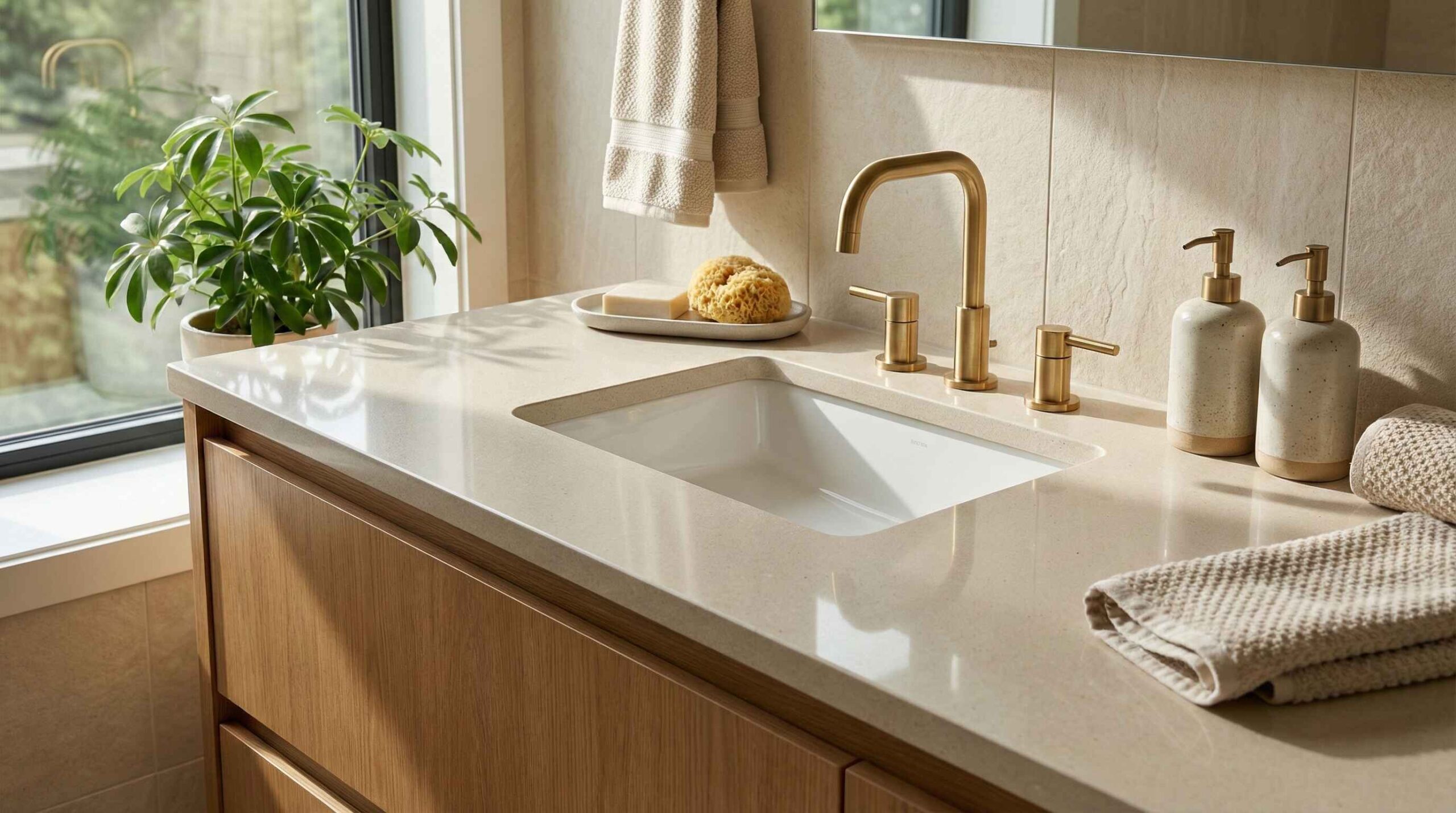 Laguna Madre presents a soft, warm gray base with a calm and coastal aesthetic. The surface is detailed with fine, sandy speckling and accented by delicate, whisper-thin white veining that drifts randomly across the slab. This subtle, organic pattern mimics the weathered look of driftwood or natural limestone, offering a gentle texture that adds depth without overwhelming the eye. Relaxed and versatile, Laguna Madre is a perfect fit for coastal, Scandinavian, and modern minimalist interiors, creating a serene, neutral foundation for islands, countertops, and bathroom vanities where a light, earthy touch is desired.