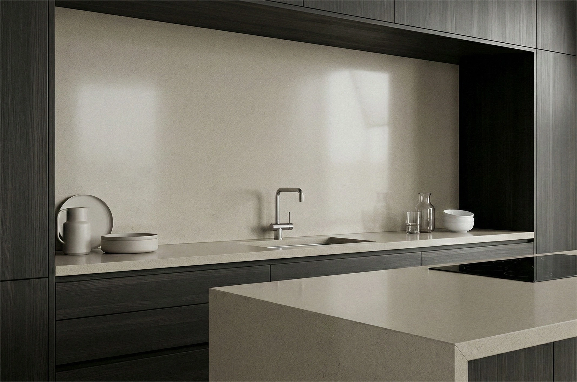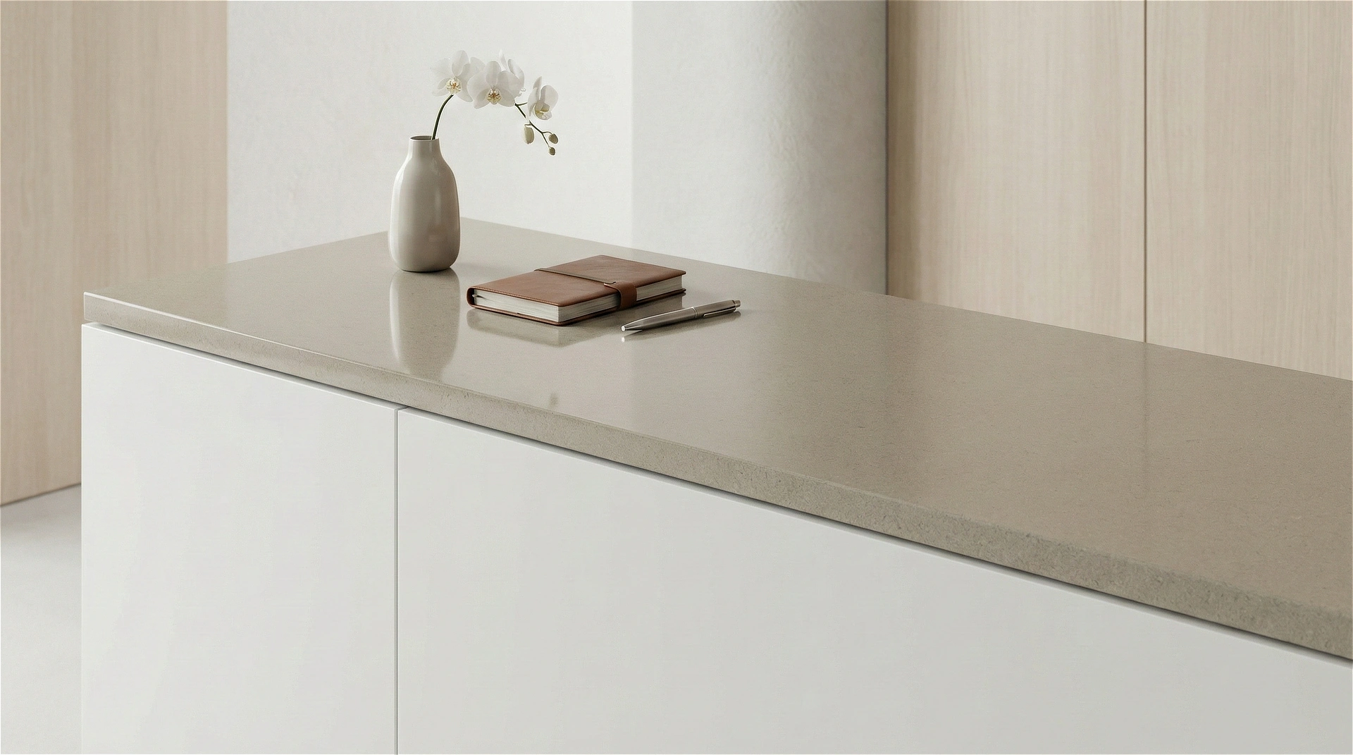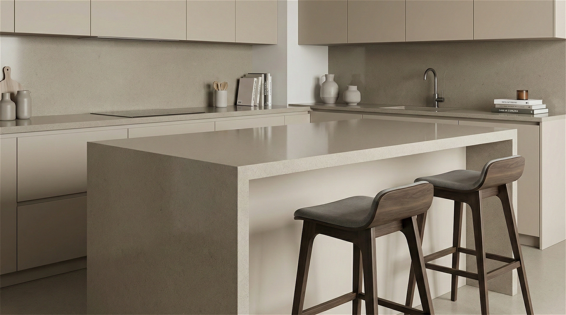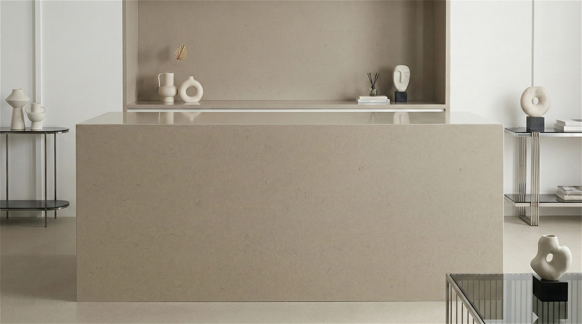 Alamo Sand features a warm, earthy taupe base with a smooth and uniform aesthetic. The surface is defined by a subtle, fine-grained texture that creates a soft, matte-like appearance, similar to honed limestone or clay. This cohesive, low-contrast design provides a grounding neutral tone that bridges the gap between beige and gray, offering versatility without the distraction of heavy patterns or veining. Understated and timeless, Alamo Sand is an ideal choice for minimalist, transitional, and modern organic interiors, serving as a quiet, complimentary foundation for countertops, backsplashes, and islands where a warm, solid color is desired.