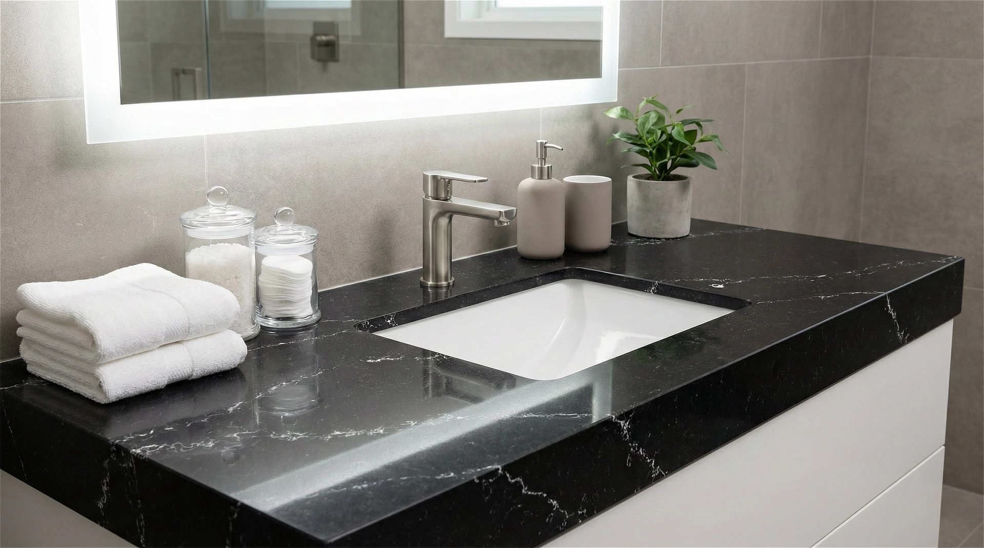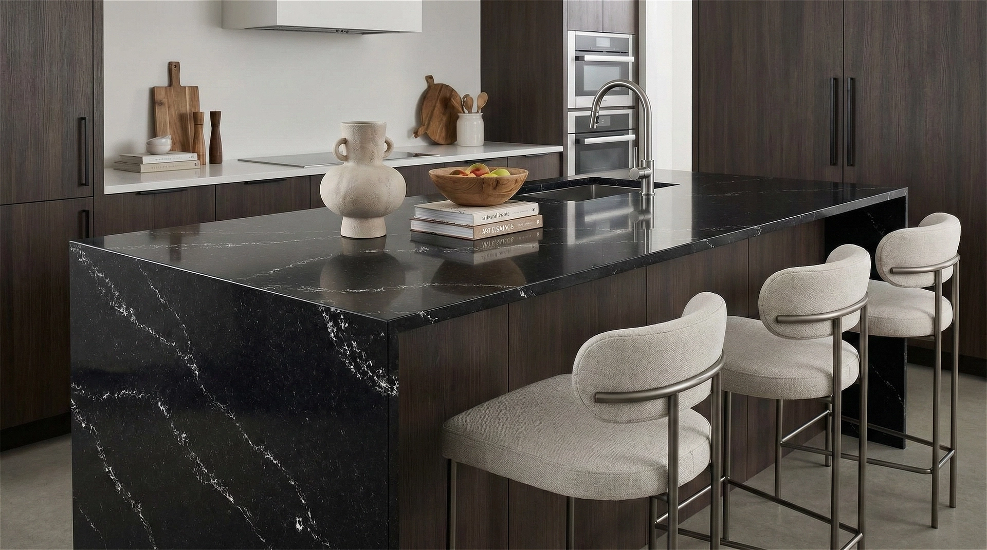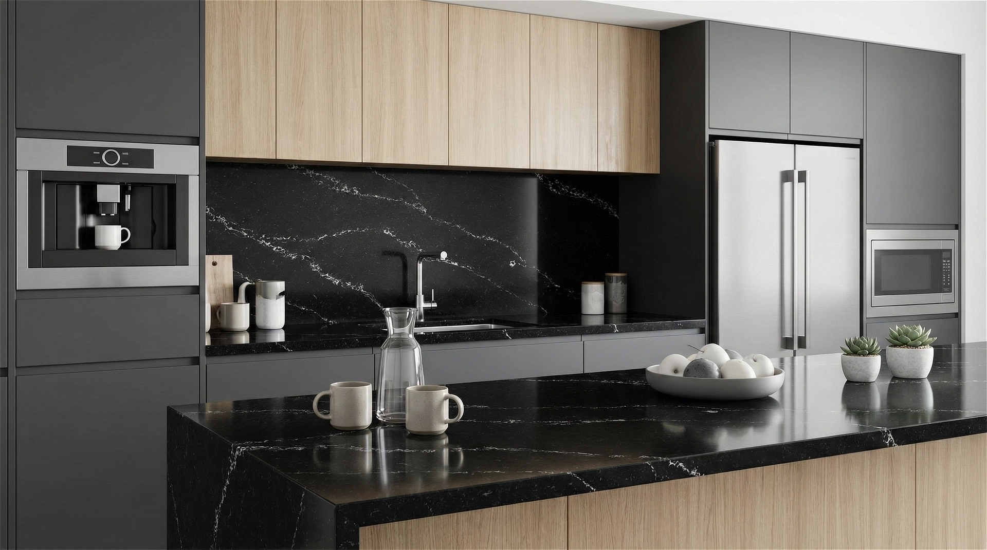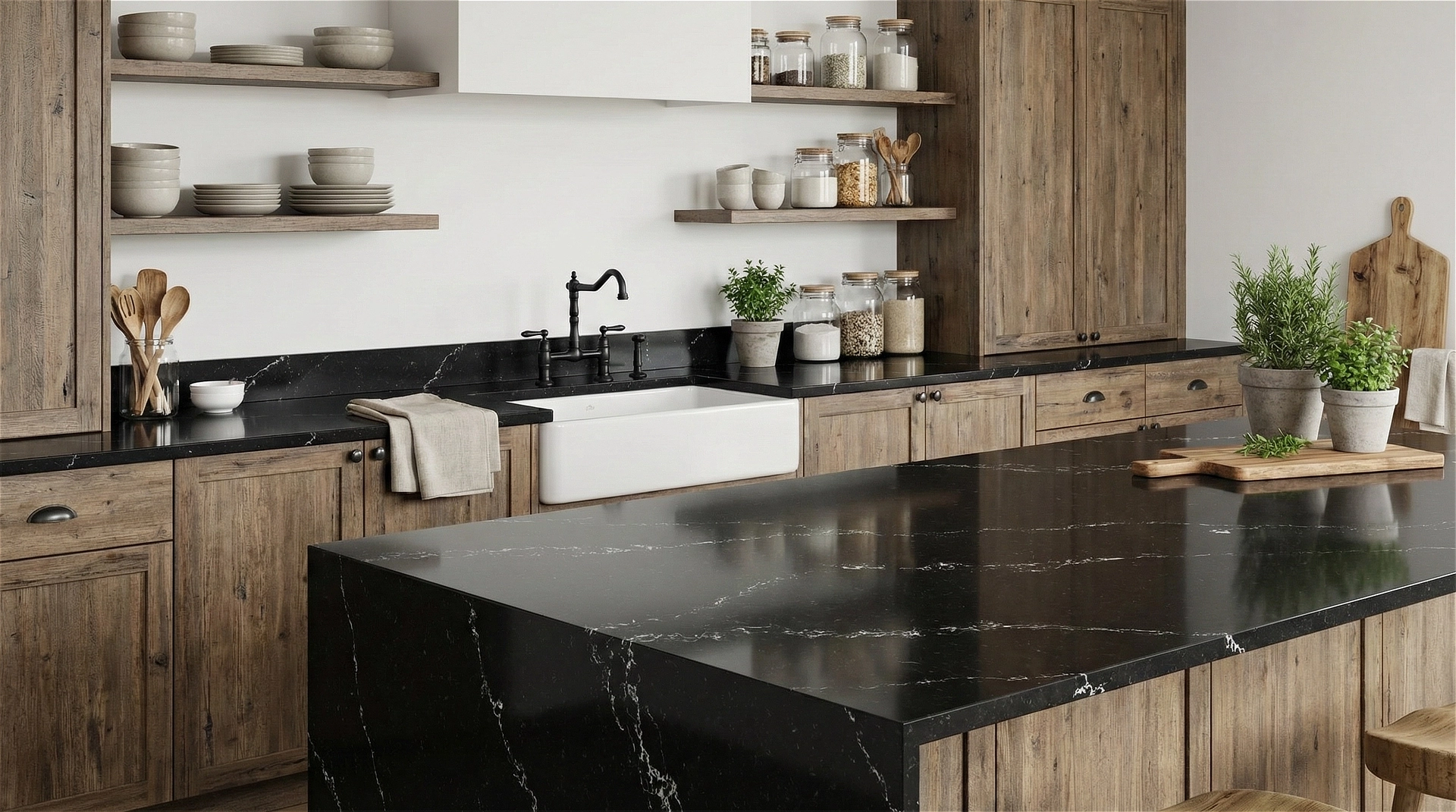 Black Lasso features a bold and sophisticated aesthetic, defined by a deep black base that exudes elegance and modernity. Delicate white veining sweeps diagonally across the surface, creating a striking contrast that mimics the natural beauty of marble. The veins vary in thickness and pattern, adding depth and visual interest without overwhelming the sleek, dark background. Ideal for contemporary interiors, this quartz is perfect for countertops, backsplashes, and feature walls where a dramatic yet refined statement is desired.