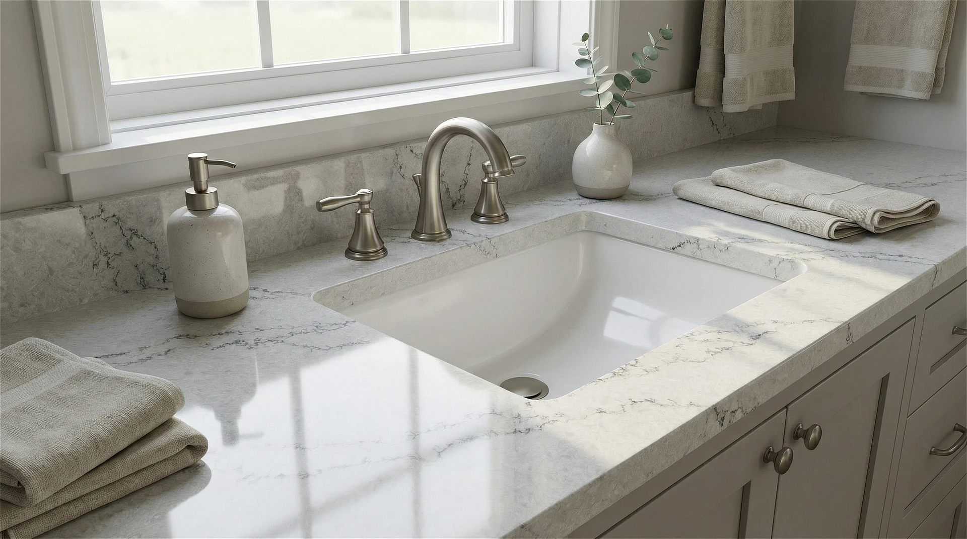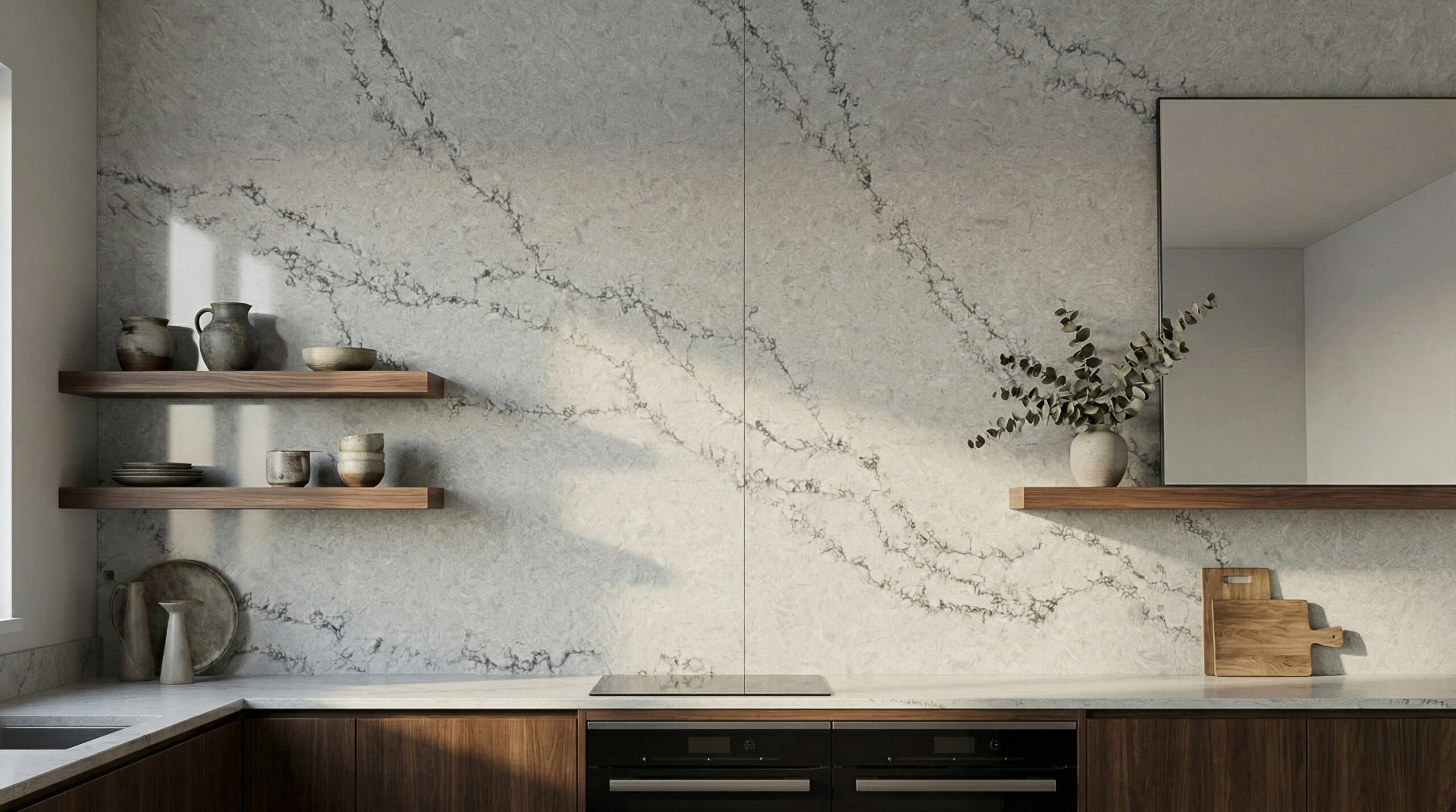 Calacatta Velvet features a soft, misty gray base with a refined and fluid aesthetic. The surface is swept by a network of charcoal-gray veining that branches diagonally across the slab with graceful, purposeful movement. These veins are intricate and slightly fractured, mimicking the natural fissures of premium Italian marble, while the background offers a subtle, tonal depth that feels smooth and cohesive. Elegant and composed, Calacatta Velvet is a sophisticated choice for transitional, classic, and modern luxury interiors, creating a distinguished foundation for islands, countertops, and backsplashes where a harmonious blend of softness and structure is desired.