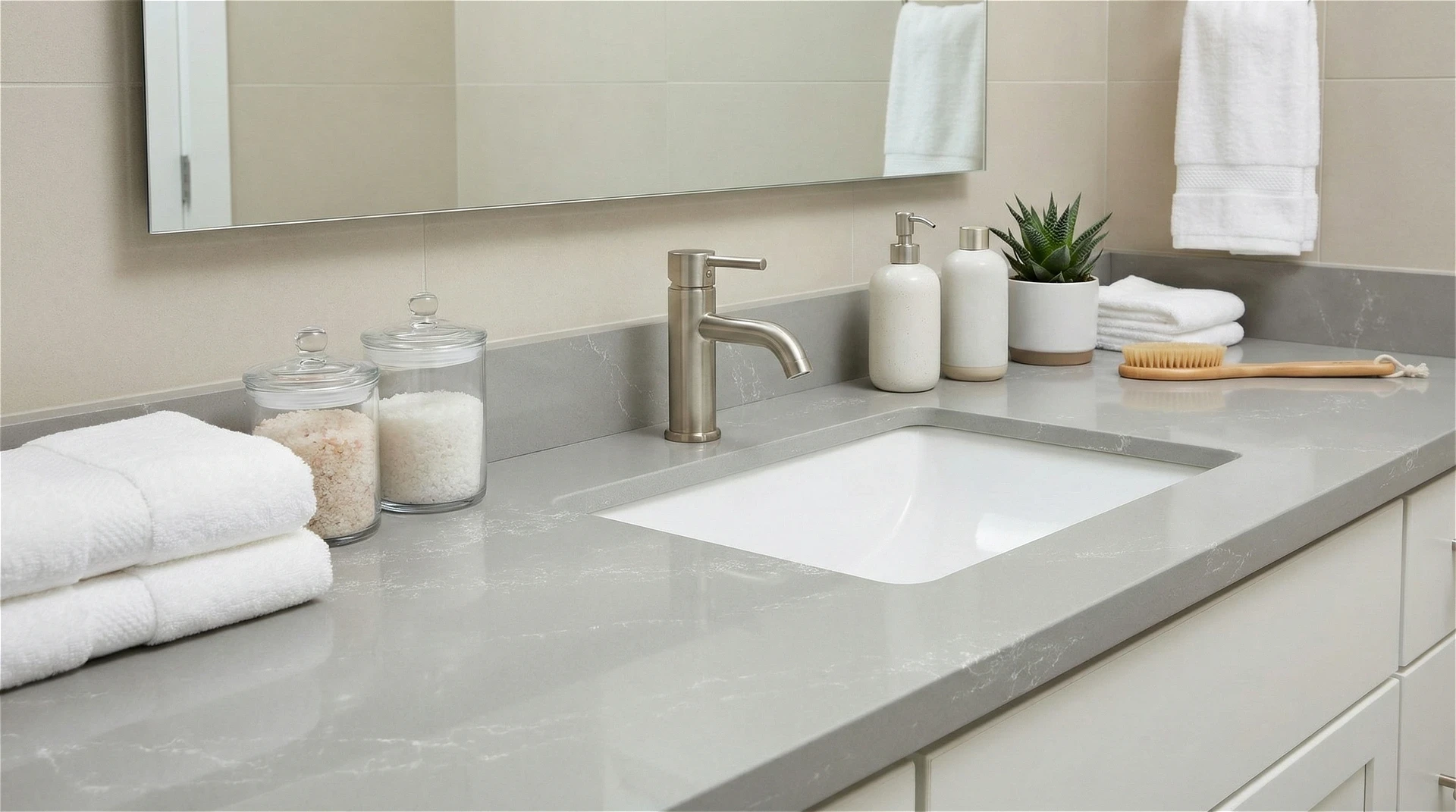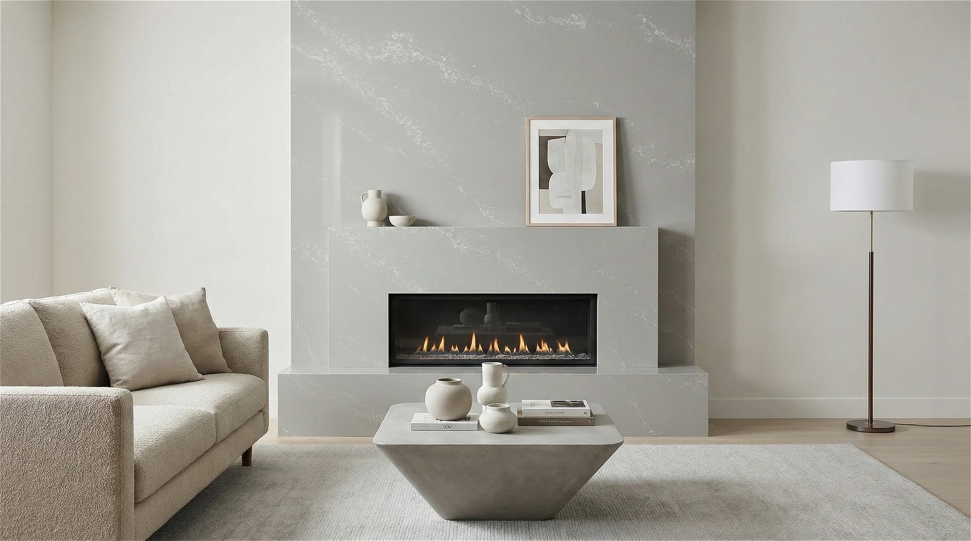 Classic Waltz features a soft, dove-gray base with a graceful and fluid aesthetic. The surface is swept by delicate, crystallized white veining that ripples across the slab in a gentle diagonal flow. This refined design creates a soothing, airy atmosphere, making it a perfect choice for transitional islands and countertops.