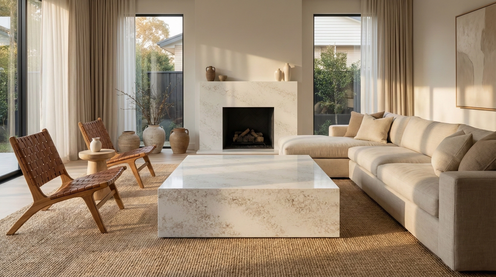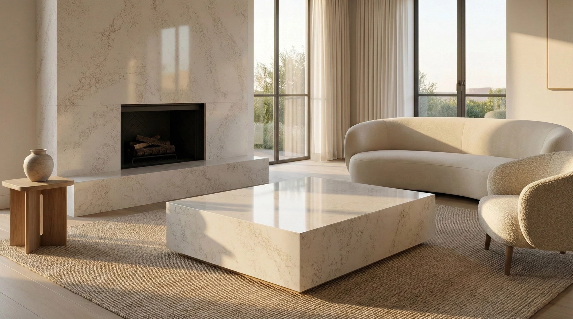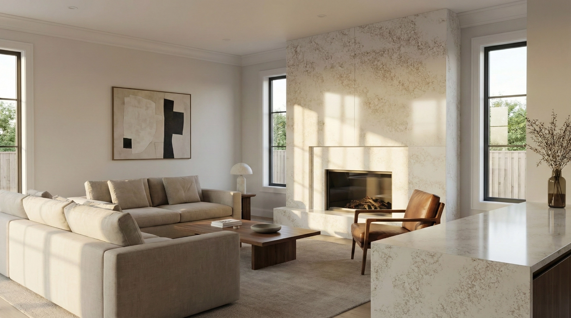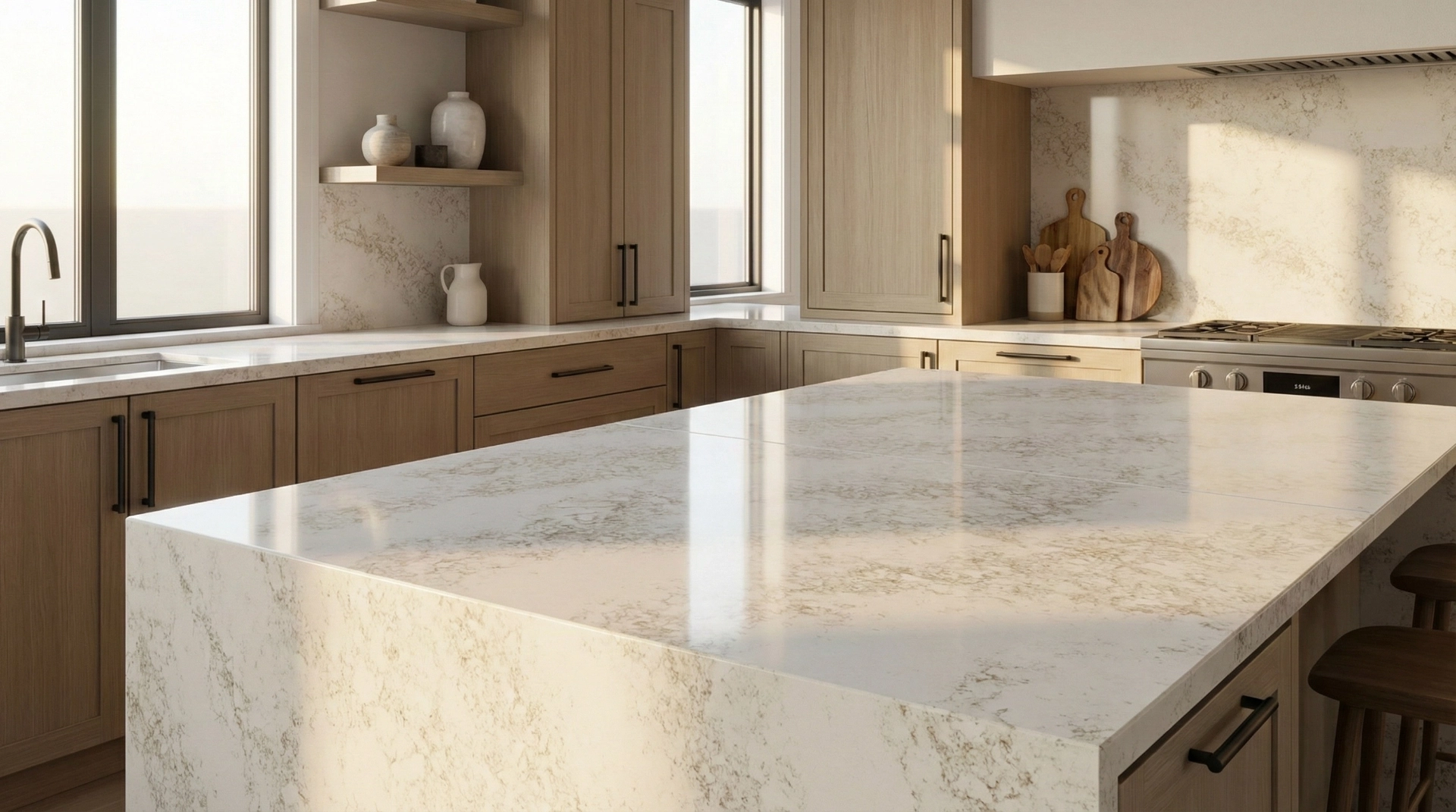 Denali Gold features a soft, elegant surface with a warm white base gently infused with subtle golden-beige veining. The pattern is finely textured and evenly dispersed, creating a delicate, cloud-like appearance rather than bold, linear movement. Flecks and wisps of muted gold and light taupe add depth and warmth, giving the surface a natural, stone-inspired character without overpowering the overall brightness. The result is a refined, airy aesthetic that feels timeless and versatile—ideal for spaces seeking a light, sophisticated look with understated warmth.