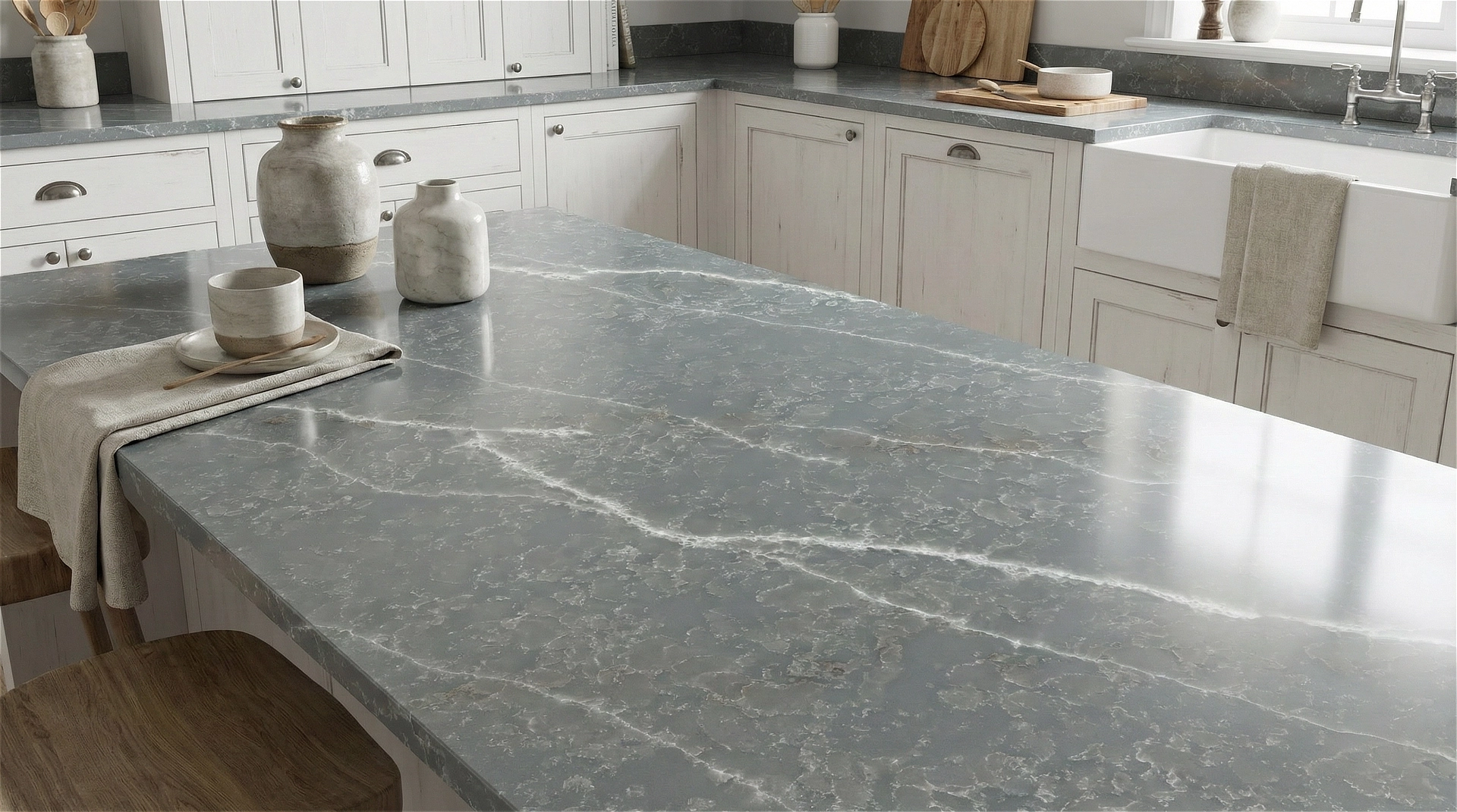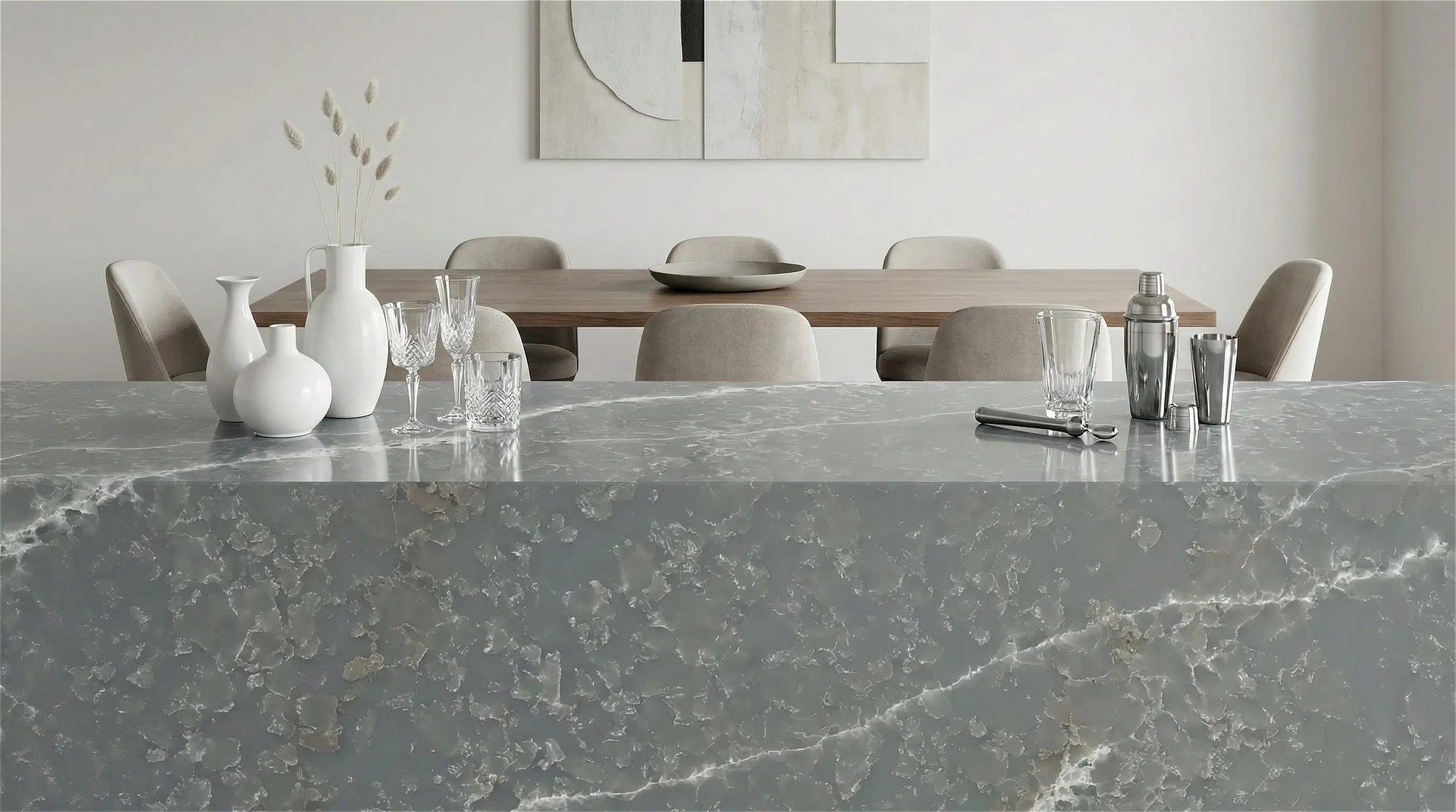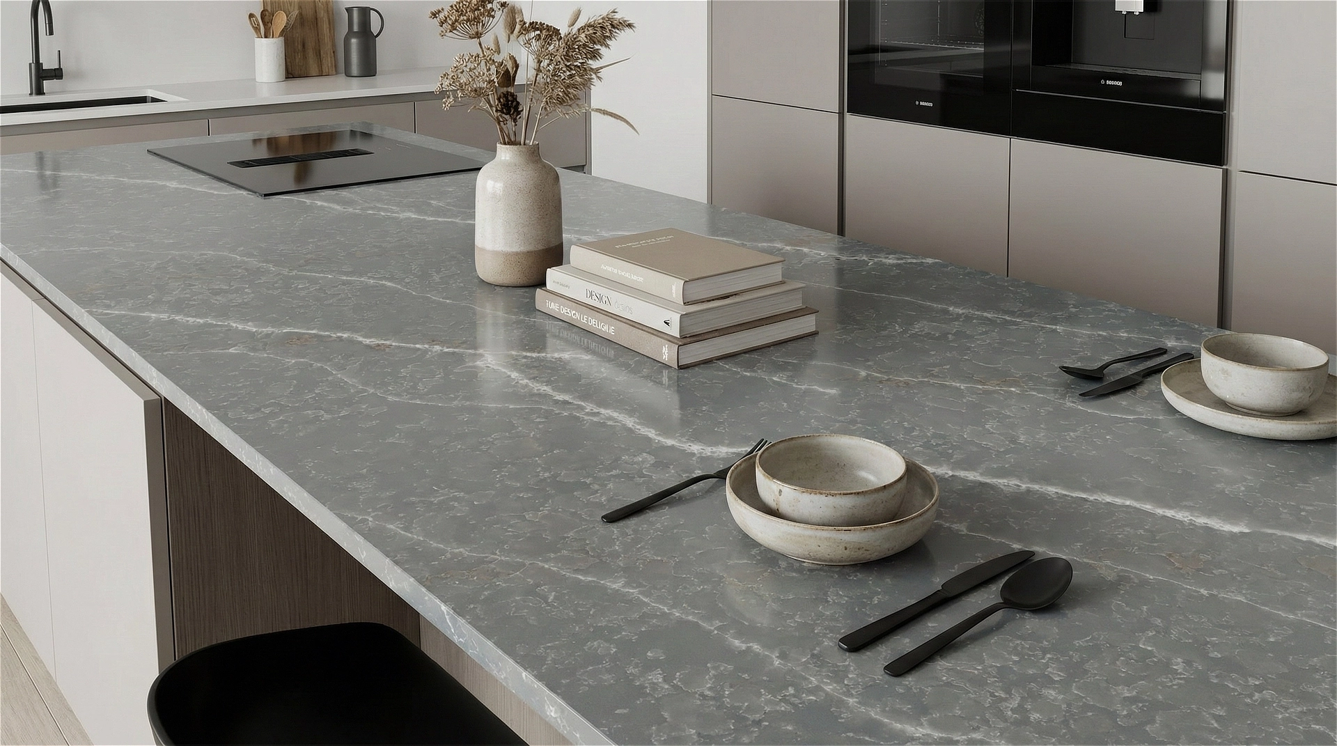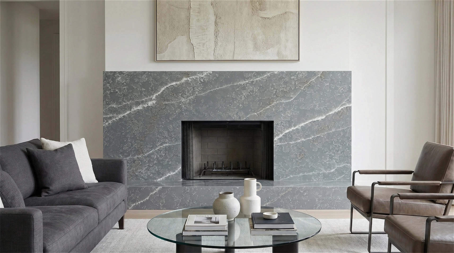 Emperors Legacy features a commanding, deep slate-gray base with a rugged and dramatic aesthetic. The surface is forcefully interrupted by bold, jagged veins of crystallized white that tear across the slab with electric intensity, resembling lightning strikes or the raw fissures of natural quartzite. These striking lines are deepened by underlying drifts of warm earth tones and subtle textural mottling, adding organic complexity to the powerful contrast. Bold and sophisticated, Emperor Legacy is an exceptional choice for modern industrial and luxury interiors, serving as a dynamic focal point for kitchen islands, fireplace surrounds, and feature walls where a strong, geode-like character is desired.