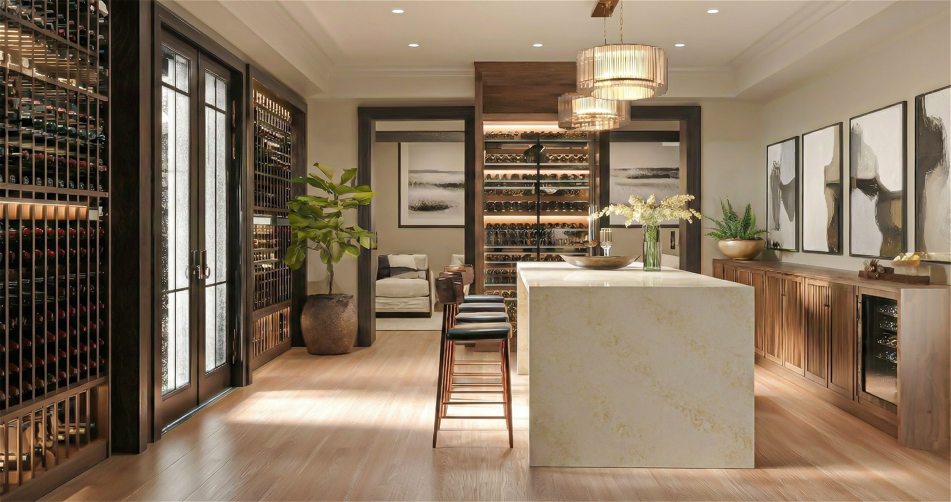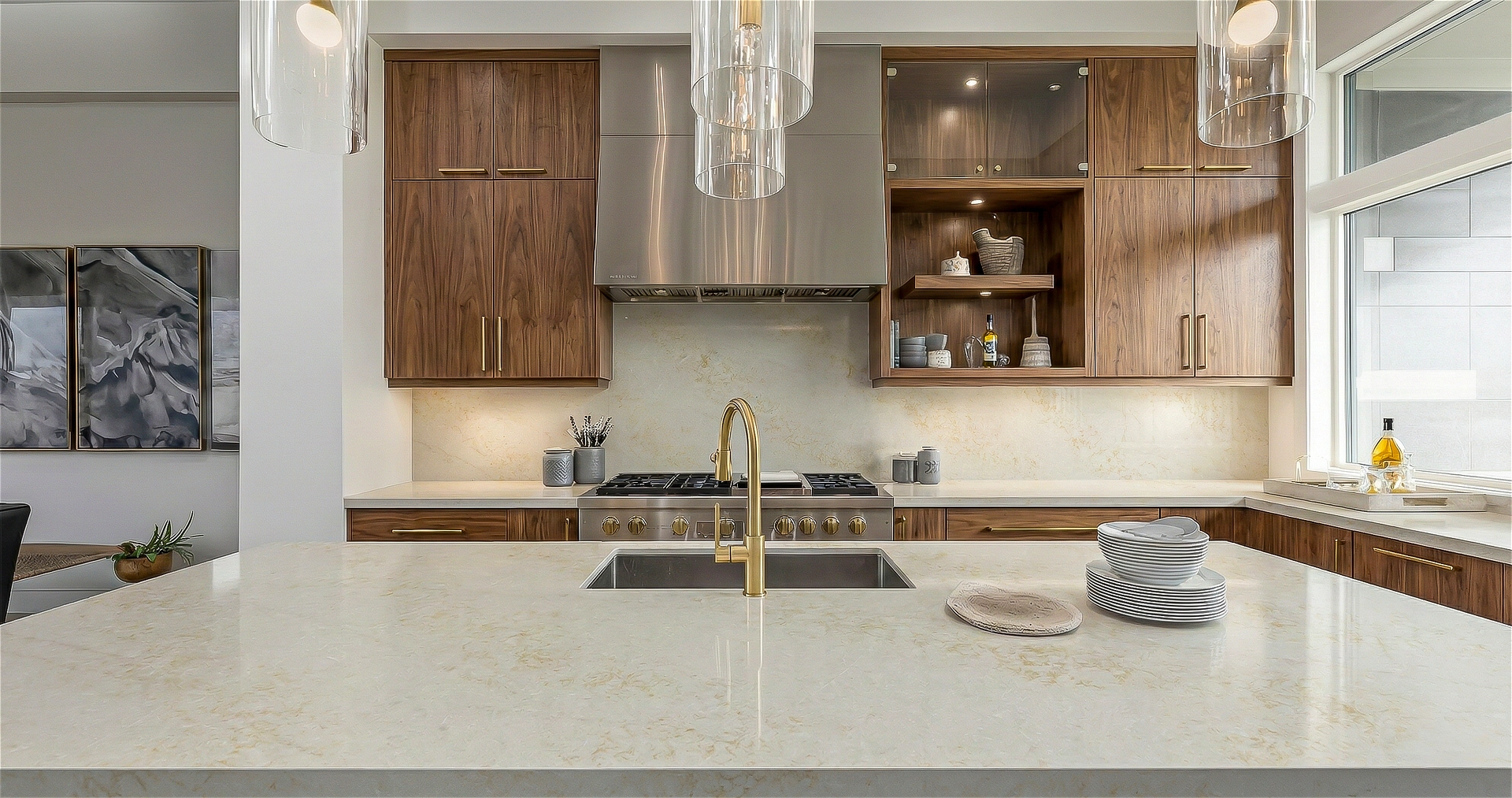 Enchanted is a sophisticated quartz surface designed to mimic the luxurious depth and complexity of natural quartzite, specifically resembling high-end stones like Taj Mahal. It features a translucent, milky white background with a crystalline quality that suggests deep layering rather than a flat, painted surface. This icy base is intricately overlaid with a dense, brecciate web of warm honey-gold and soft amber veining, creating a rich, crackled texture that shimmers under a polished finish. The design expertly balances the coolness of its crushed-ice aesthetic with the inviting warmth of its golden webbing, making it an opulent, jewel-box material ideal for traditional or high-end transitional spaces that require a timeless, heavy-stone look.