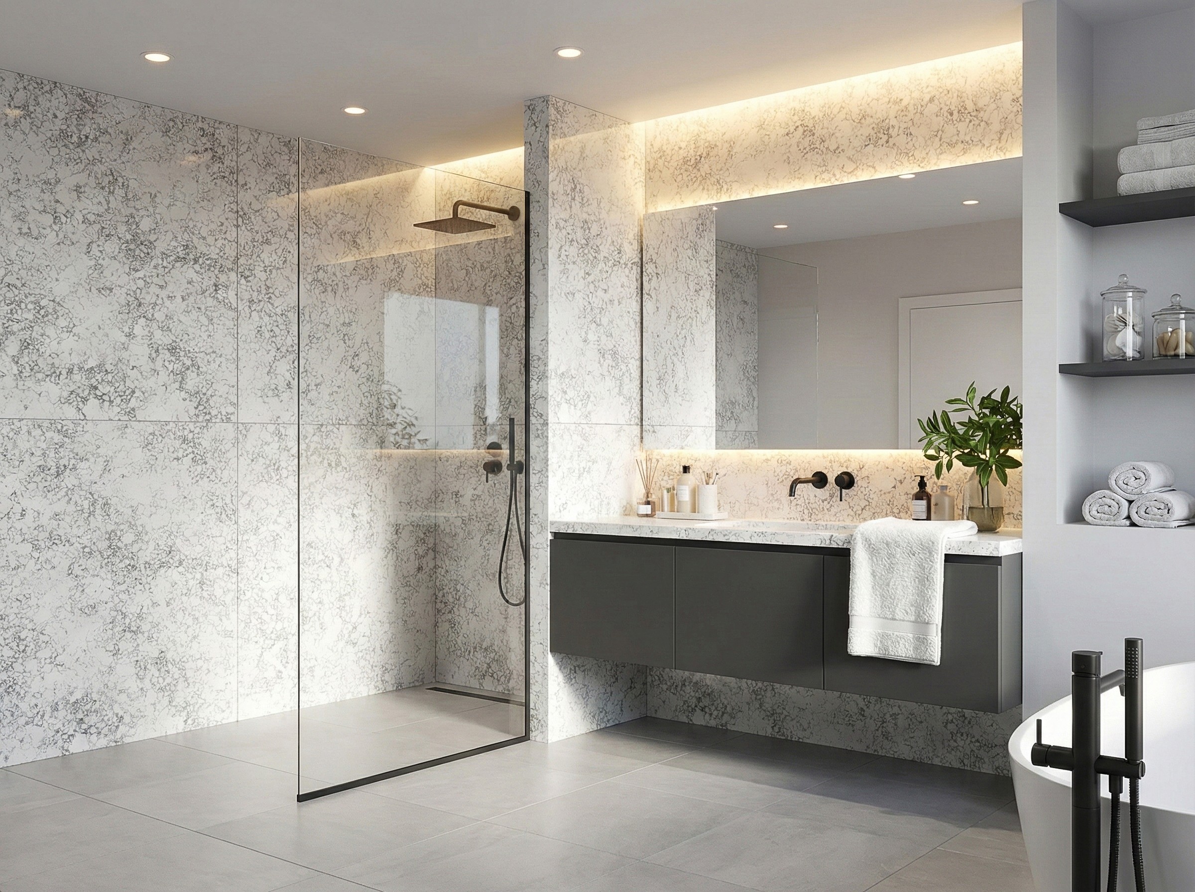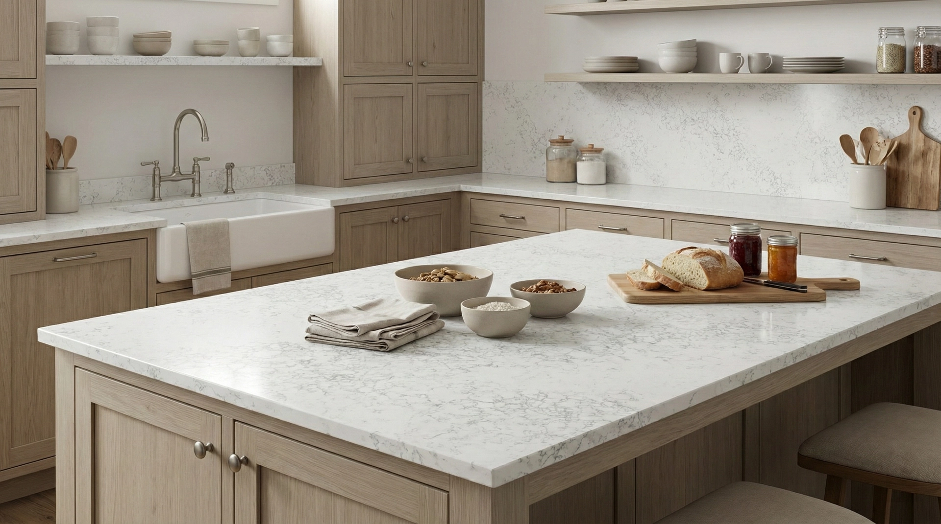 Foraker Snow features a radiant, icy white base with a bold and dramatic aesthetic. The surface is traversed by an intricate network of deep charcoal and steel-gray veining, creating a dense, mosaic-like pattern that evokes the fractured beauty of a frozen landscape or brecciated marble. This high-contrast design delivers intense visual movement and depth, transforming the surface into a piece of art. Commanding and sophisticated, Foraker Snow is a definitive choice for modern, industrial, and luxury interiors, ideal for statement islands, feature walls, and countertops where a dynamic, architectural focal point is desired.