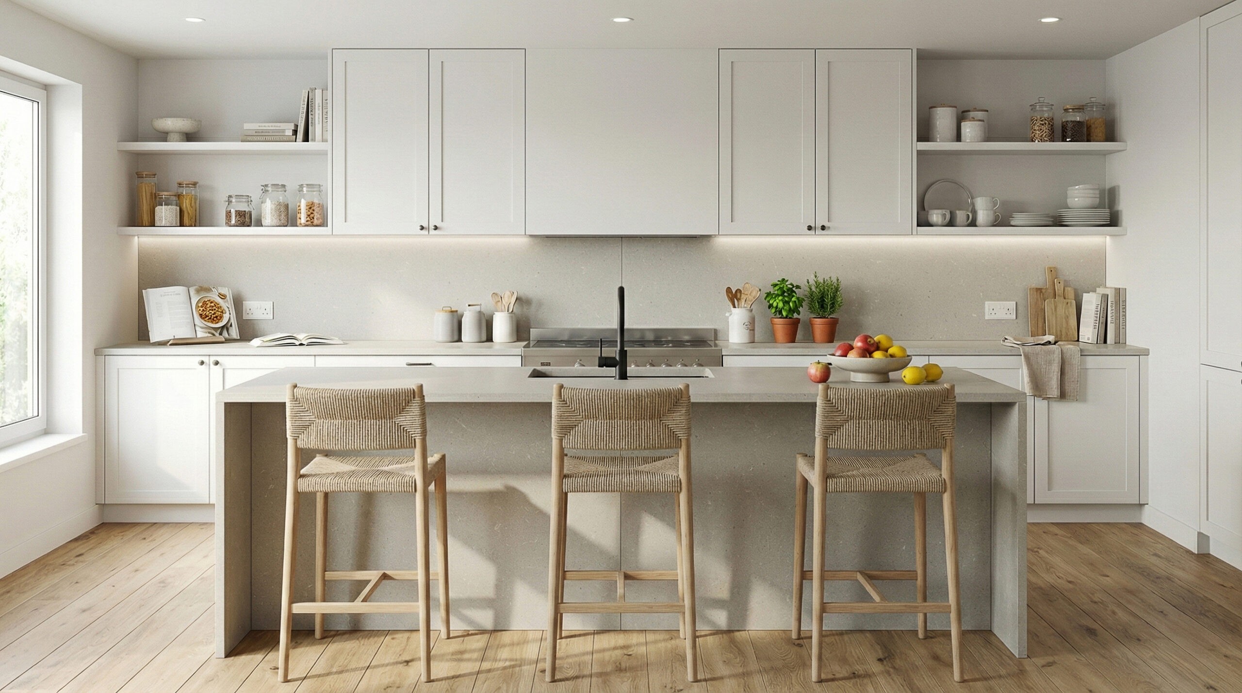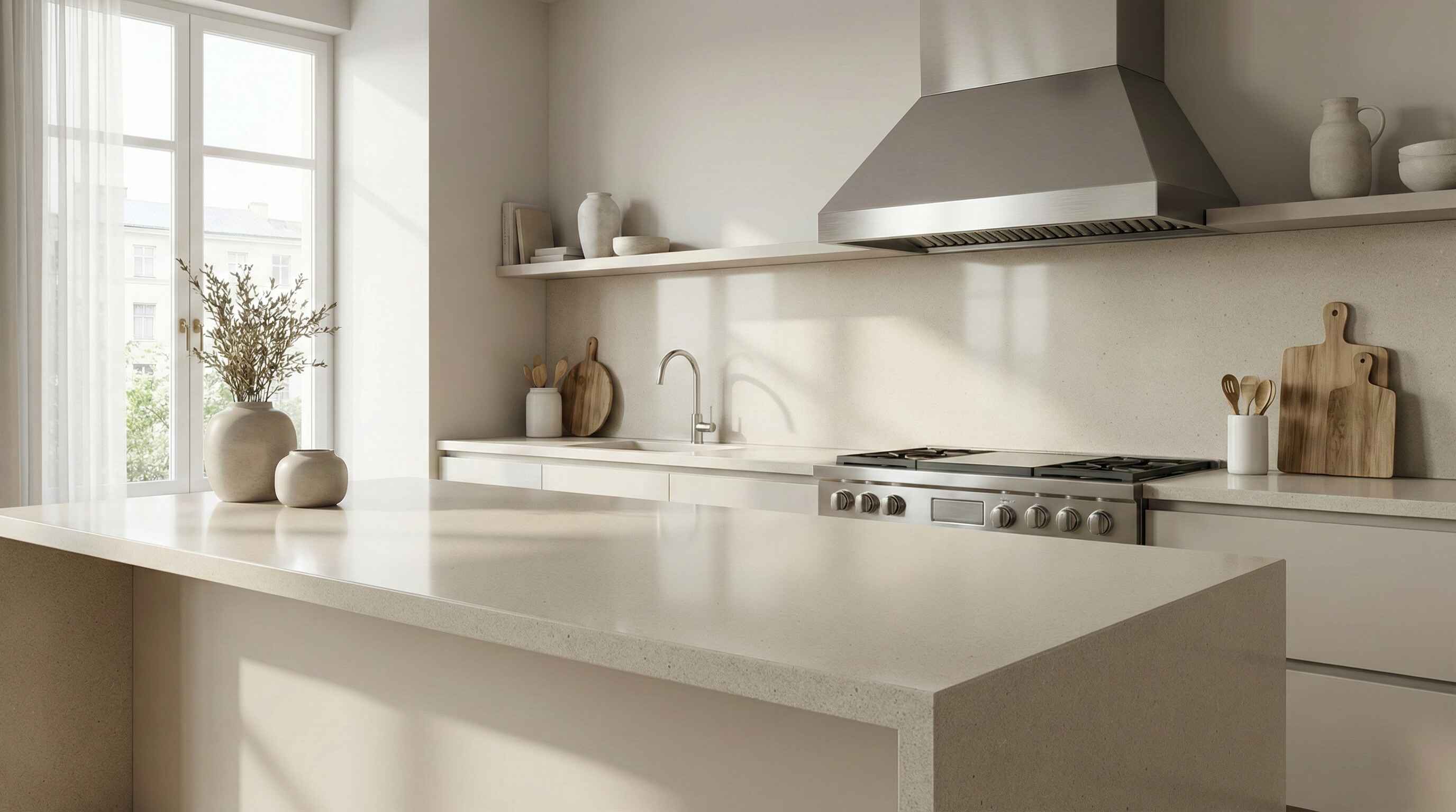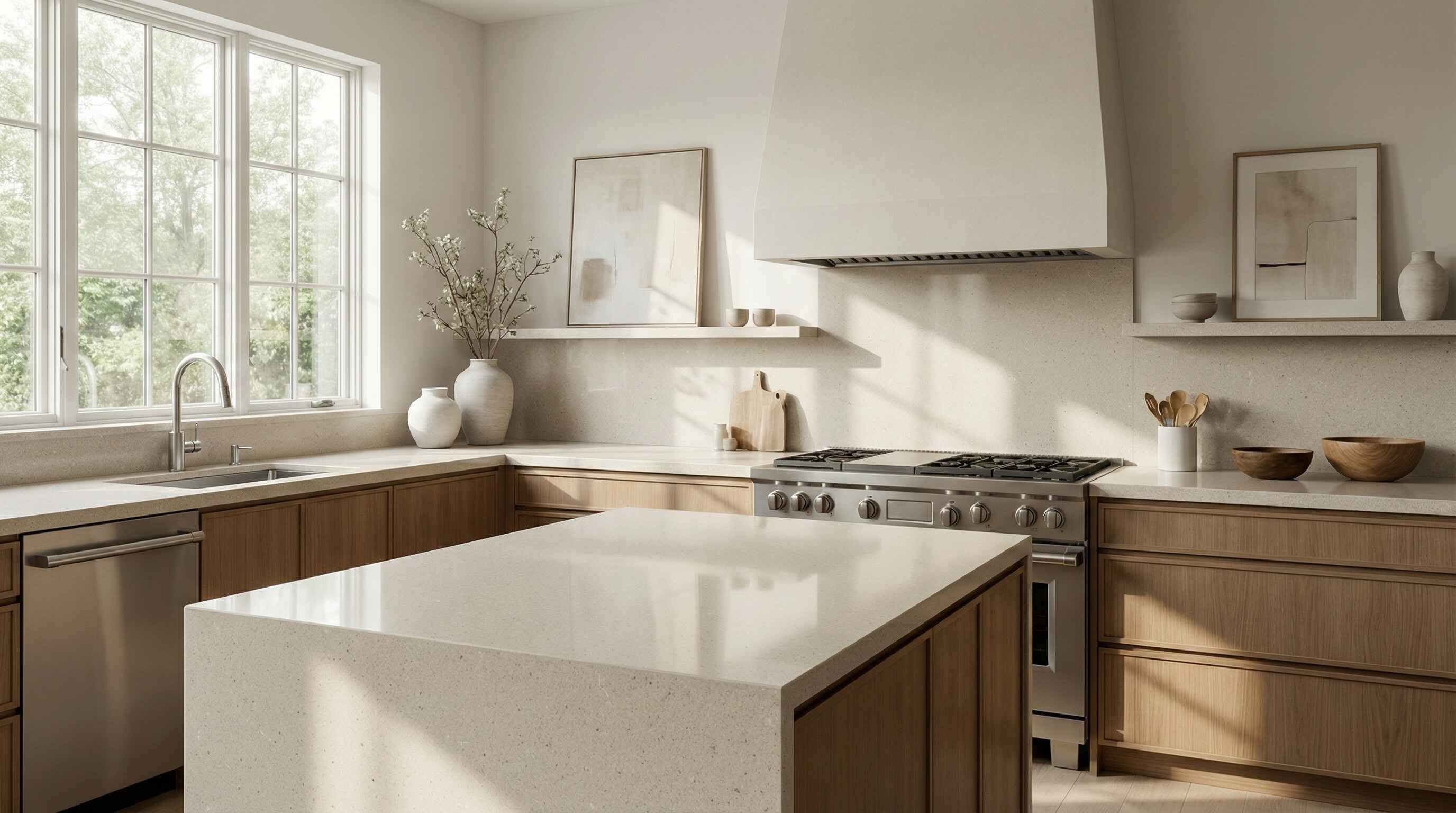 Laguna Madre presents a soft, warm gray base with a calm and coastal aesthetic. The surface is detailed with fine, sandy speckling and accented by delicate, whisper-thin white veining that drifts randomly across the slab. This subtle, organic pattern mimics the weathered look of driftwood or natural limestone, offering a gentle texture that adds depth without overwhelming the eye. Relaxed and versatile, Laguna Madre is a perfect fit for coastal, Scandinavian, and modern minimalist interiors, creating a serene, neutral foundation for islands, countertops, and bathroom vanities where a light, earthy touch is desired.