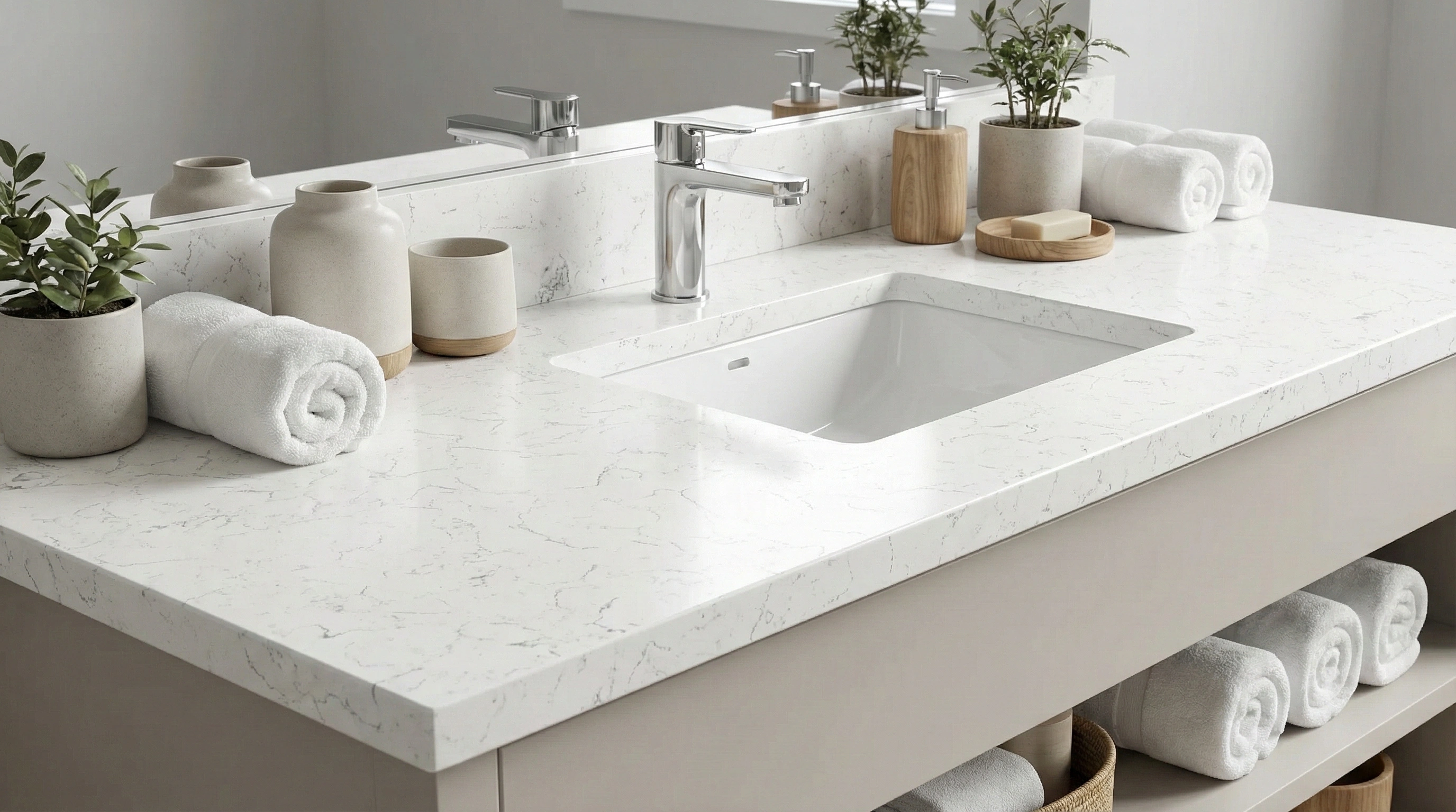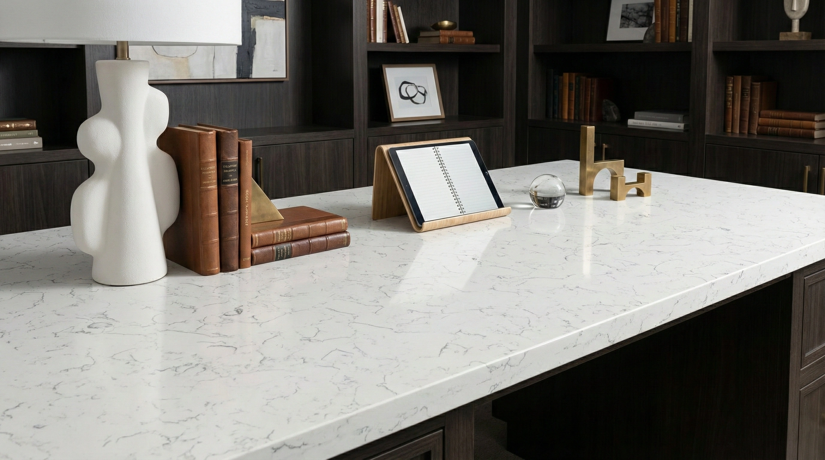 Lone Whispers features a crisp, brilliant white base with a highly intricate and textural aesthetic. The surface is defined by a dense network of fine, charcoal-gray fissures that intersect in a mosaic-like "crackle" pattern, reminiscent of crazed porcelain or the delicate webbing of dried earth. This consistent, all-over design offers high-contrast detail without the heavy directionality of traditional marble, creating a look that is both modern and architecturally engaging. Sharp and distinct, Lone Whispers is an ideal choice for contemporary and urban interiors, providing a dynamic, textured foundation for islands, countertops, and bathroom vanities where a unique, graphic presence is desired.
