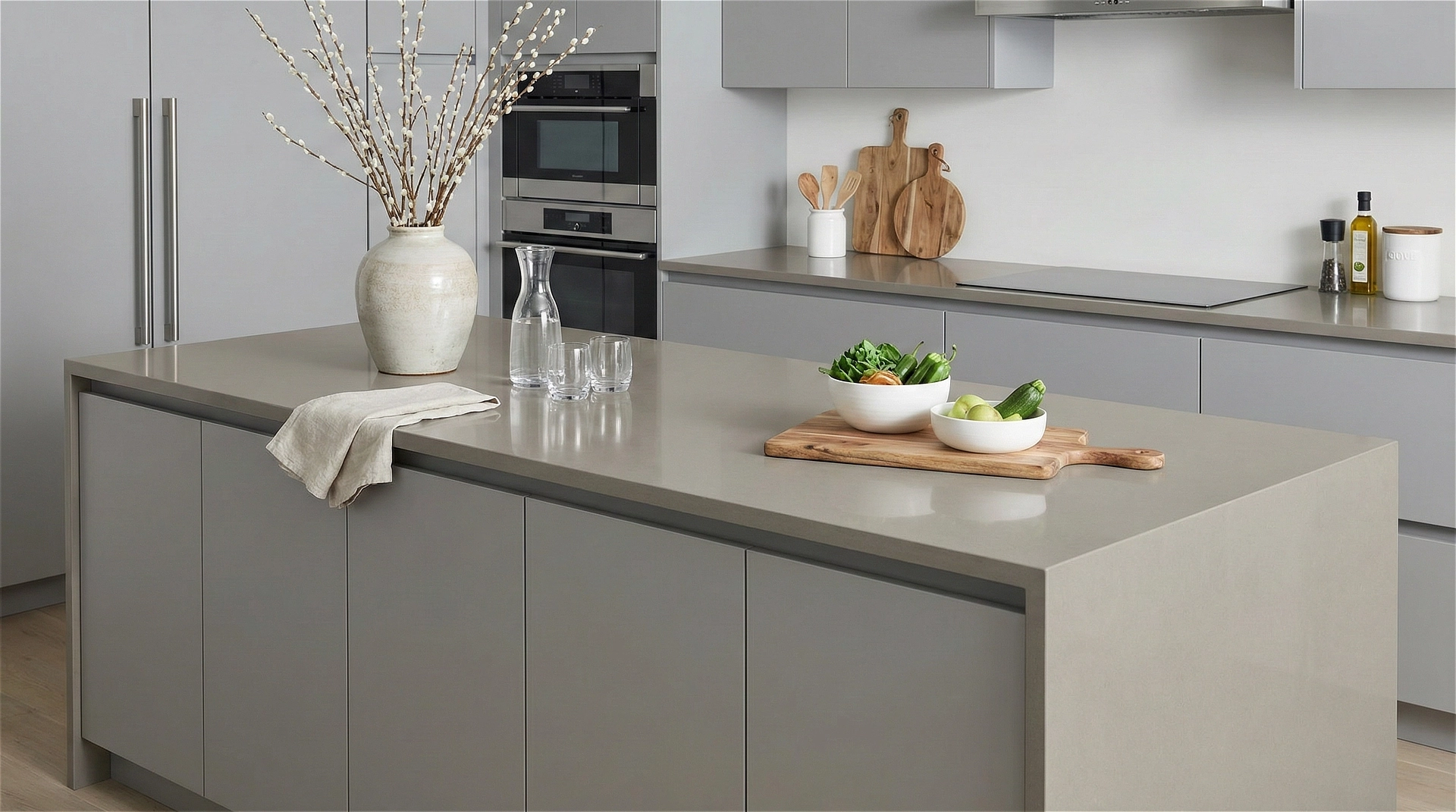 Prairie Mist presents a sophisticated, mid-tone gray base infused with warm, earthy undertones. The surface is defined by fine, dense speckling that mimics the organic texture of natural limestone or honed concrete. This subtle, granular pattern adds depth and a soft visual interest without the distraction of bold veining, maintaining a sleek and cohesive appearance. Grounded and contemporary, Prairie Mist is an exceptional choice for industrial, modern farmhouse, and minimalist interiors, providing a solid, neutral anchor for countertops, islands, and architectural accents where a calming, durable elegance is required.