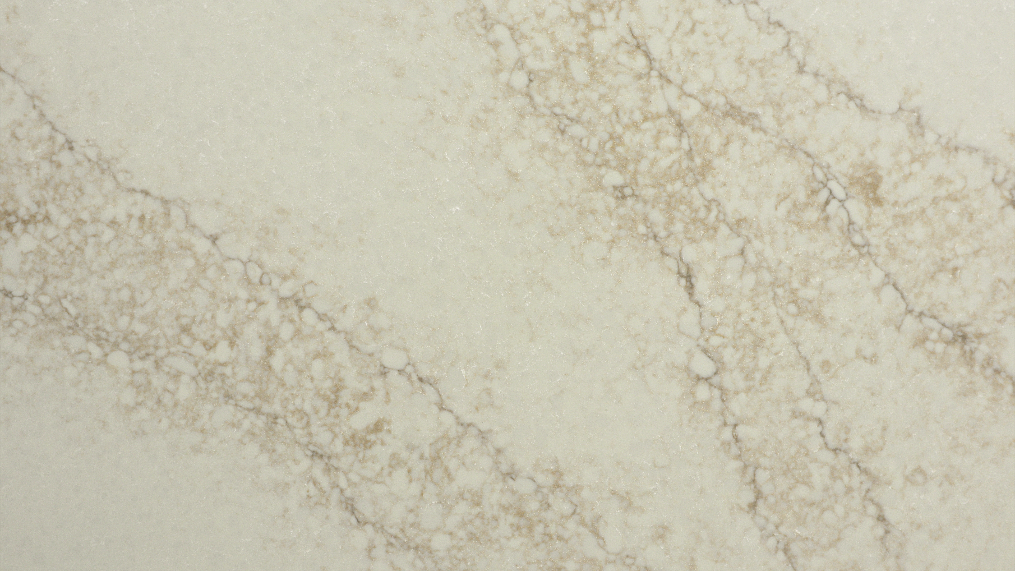 Spellbound features a soft, creamy ivory base with a flowing and organic aesthetic. The surface is defined by broad, sweeping bands of sandy beige and warm taupe aggregates that create a dimensional, pebbled appearance, similar to natural travertine or a wind-swept shoreline. This dynamic, medium-contrast design provides a gentle sense of movement that draws the eye, offering visual interest without the sharpness of traditional linear veining. Elegant and inviting, Spellbound is an ideal choice for coastal, traditional, and transitional interiors, serving as a warm, harmonious foundation for countertops, backsplashes, and islands where a soft, natural flow is desired.