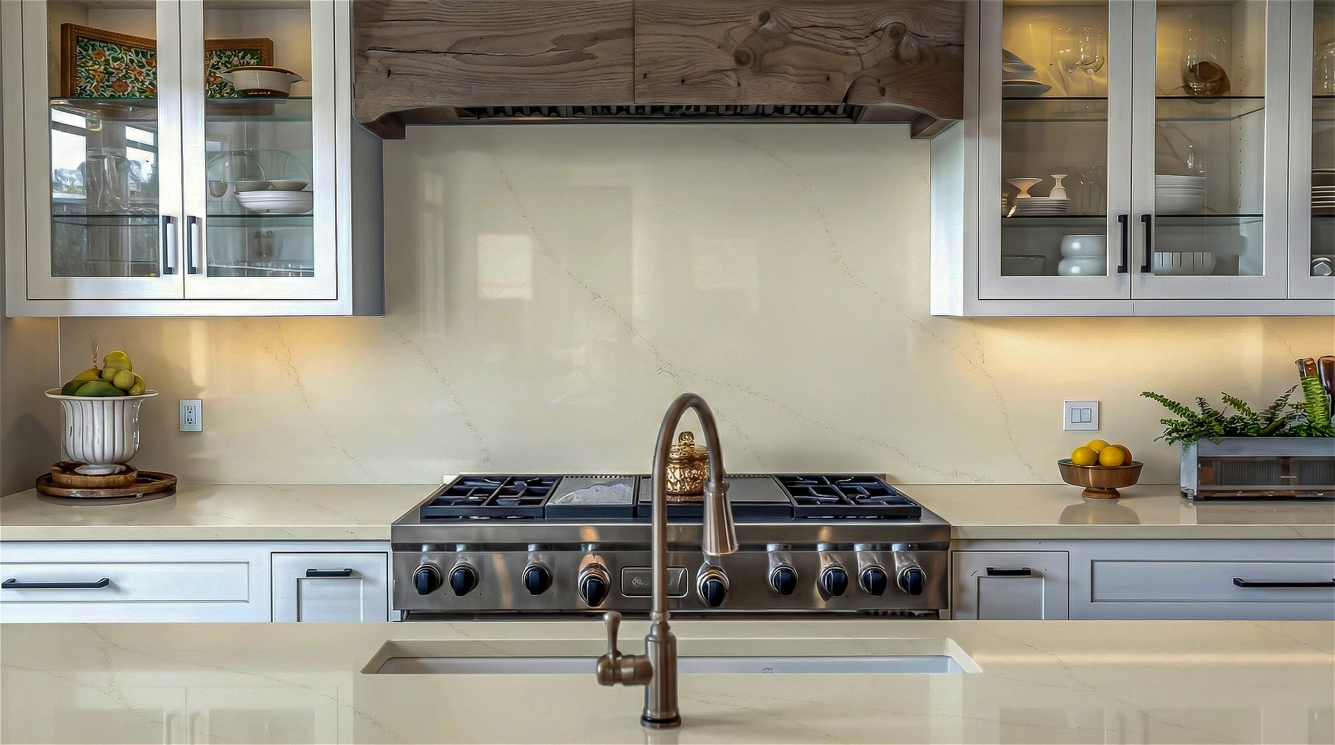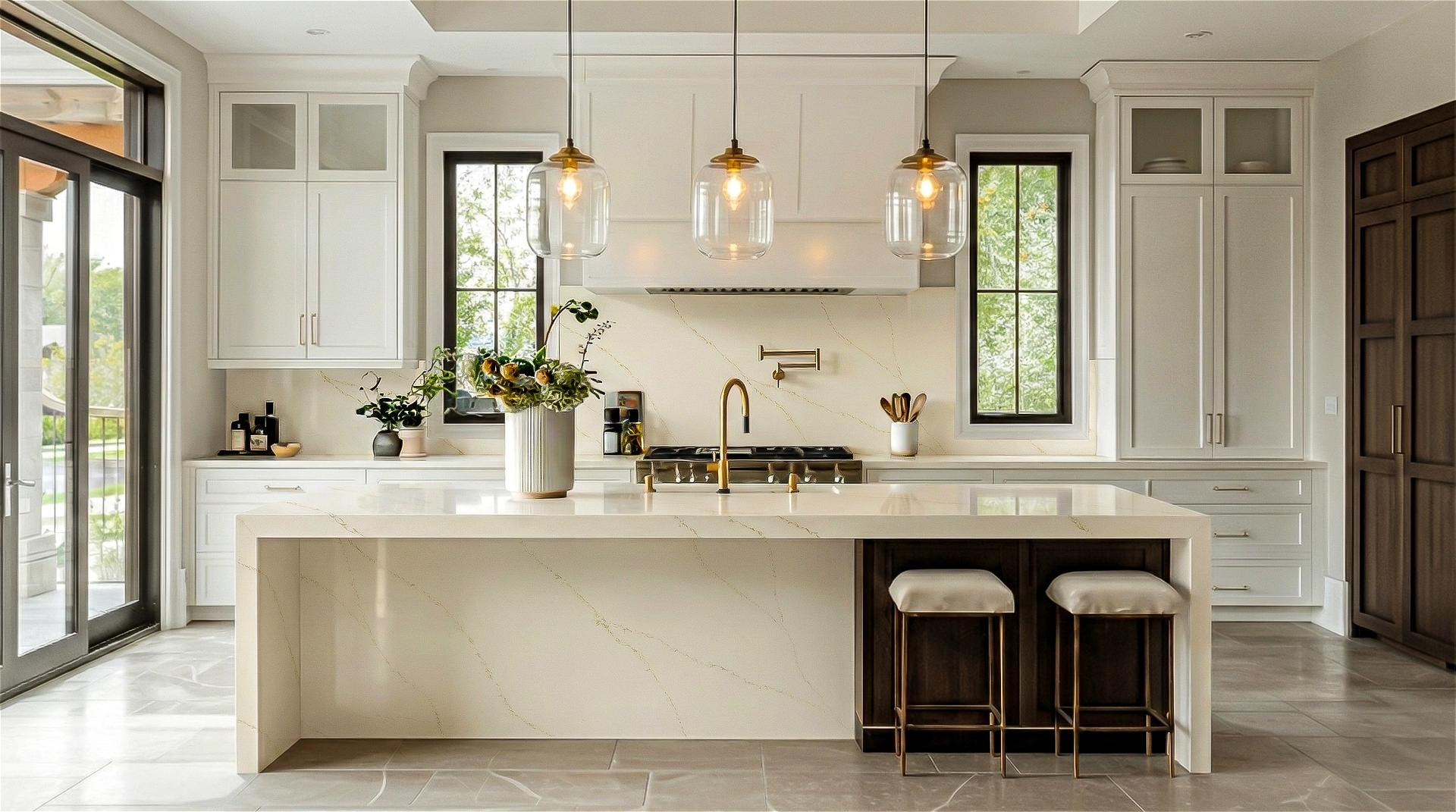 Yukon Gold features a luminous, warm-toned base that radiates a soft, inviting glow. The surface is characterized by delicate, ethereal veining in shades of honey-gold and toasted almond that drift across the slab like sunlight through mist. The aesthetic is one of understated opulence, mimicking the gentle warmth of rare, sun-bleached stone while maintaining a clean, contemporary clarity. Versatile and sophisticated, Yukon Gold is an ideal foundation for Modern Organic, Warm Minimalist, and Transitional luxury interiors. It is particularly effective for expansive kitchen islands, waterfall edges, and floor-to-ceiling fireplace surrounds, where its golden undertones can be paired with natural wood finishes and brushed brass accents to create a cohesive, high-end sanctuary.